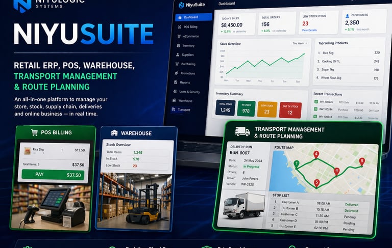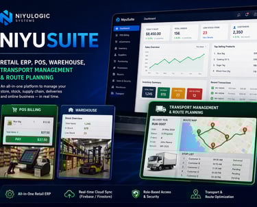 NiyuSuite is a premium, enterprise-grade retail ERP platform that unifies POS, inventory, warehousing, transport management, and route planning into one intelligent system. Designed to streamline retail operations at scale, it delivers connected commerce, stronger operational control, faster workflows, and smarter delivery execution. From checkout to final delivery, NiyuSuite helps businesses transform their operations, improve visibility across sales and stock, and drive growth with a single powerful platform built for speed, efficiency, and profitability.